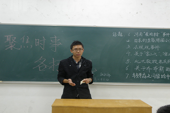 11月23日晚,我院第九期团分校暨学生班团干部培训班第四节理论课(讨论课)––“聚焦时事,各抒己见”于6B53教室顺利完结。出席此节讨论课的嘉宾有我院辩论队队长李闻达,农学111班代理班主任郭振,植科101班班长陆海洋,及校组织部孙颖、张丹。来自我院11级各班的同学参与了此次讨论。此节讨论课的讨论内容就当下发生的时事展开。