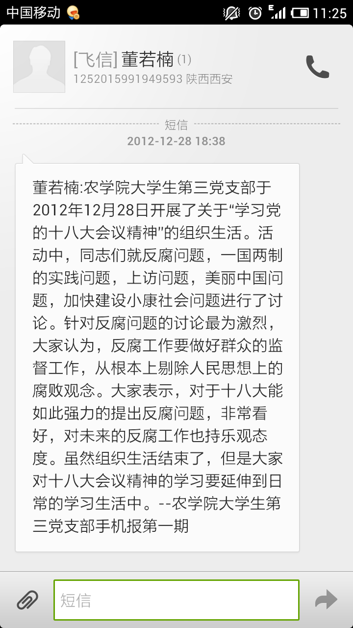 此次十八大手机报活动由党支部的学生党员作为主要编辑,由每个学生党员积极参与,在加强自己学习十八的同时,各位同志互相讨论、学习,认真的将自己的心得体会也编辑到手机报中,与每个学生党员分享,通过批评和自我批评,脚踏实地的端正自身的学习态度,努力提高自身的学习能力,以实际行动践行党的十八大精神。