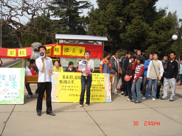3月30日下午2点,由农学院团工委和楹联文学社联合办的首届大型校园楹联擂台赛在北校区南门口热烈举行。