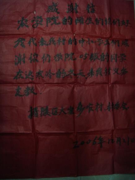 继高家庄村委会的锦旗和感谢信后又一封感谢信送到了农学院,不过这一次不是因为农村图书馆的建成,而是因为农学院义务服务队第二支队整整半年在官村、崔东沟、崔西沟的义务支教。