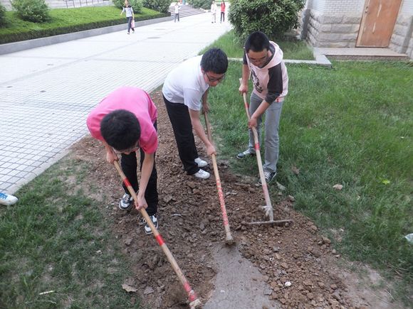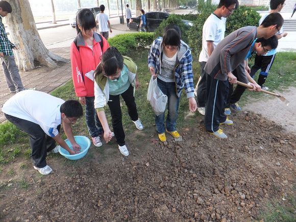 在农学院冯毅老师和校绿化中心的指导和支持下,同学们很快掌握了挖土、埋籽、培土、浇水的技术要领,然后便热情高涨、信心百倍的开始行动了。平常连锄头都没有摸过的同学们,此刻却有板有眼地当起了“园艺工程师”。大家分工合作,翻整土地、播撒草种、浇水、挂警示牌……热闹的场面温馨而快乐。半个多小时后,校园中一块块曾经的秃地就被埋上了我们绿色的希望,看着草地旁一块块承担“护草使者”的警示牌,每个人的脸上都洋溢出了满意的笑容。