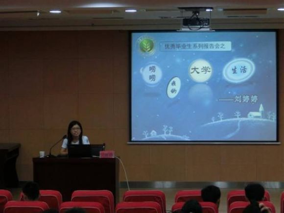 6月13日晚7:30,农学院优秀毕业生刘婷婷在北绣山报告厅带来以“唠唠我的大学生活”为主题的报告会。农学院全体大一学生参加了此次报告会。