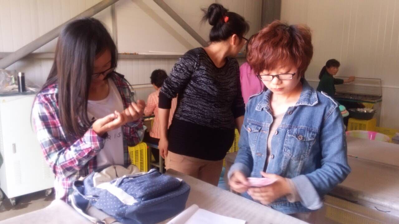 初进庄园,清冽的凉风夹杂玫瑰香气扑鼻而来,在庄园谢姐的带领下小分队成员迅速上岗进行包装作业,每个人的工作量是装8沓密封袋,1沓共有100袋,每一袋中装5个玫瑰花苞并且捋到袋底部,从袋中间进行对折以防玫瑰掉出袋外,手纸飞速转动,一盆盆装满玫瑰花苞的密封袋堆积而起,指尖积郁着玫瑰浓香与粘稠的花蜜,劳作过程中与工作人员交流得知,这些玫瑰花苞之后会被用作玫瑰香皂的制作原料。