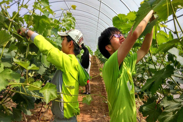 今天,队员们的任务是给葡萄摘心,同时培养葡萄向前生长的延长头。理事长让合作社的技术员给队员们讲解操作的全过程,讲解过程中,队员们不时地提出问题,技术员耐心的解答!随后队员们亲自实践,在实践中发现问题,合作社的员工和队员们一起工作,也不时地为队员们讲解其中的原理。
