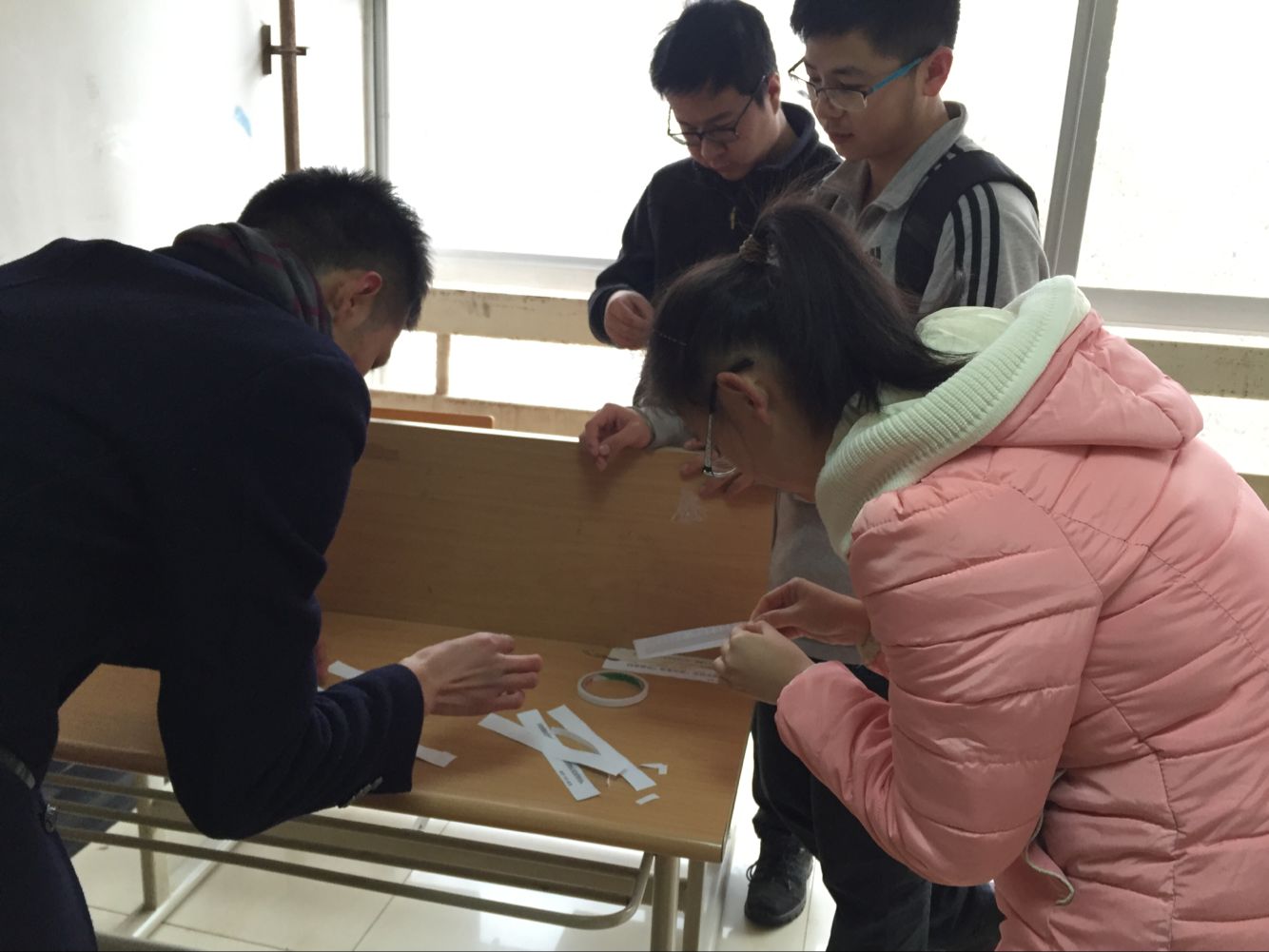 同学们在帮忙张贴标语