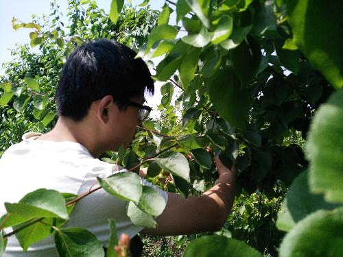 在本次活动中,队员们帮助合作社进行了部分桃树的疏果处理,并与合作社负责人有了进一步的交流。第三次进入果园,队员们已然没有了刚到时的不知所措,熟练并默契地进行相关工作,合作社负责人也在一旁耐心指导。果园中部分桃子已经成熟,飘散着阵阵香味。合作社负责人也在忙碌的工作之后请队员们品尝了刚刚采摘的桃子,队员们尝后均点头称赞。队员们一边品尝着桃子,一边聆听着合作社工作人员讲述他们与果园的故事,有看见果树生病时的担忧,也有收获时的喜悦。