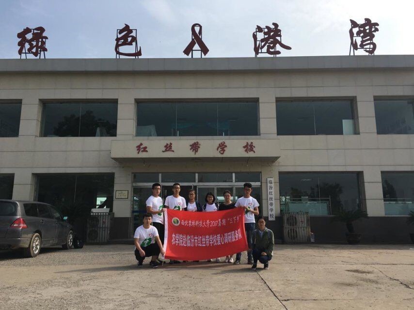 这一天天气晴朗,西北农林科技大学农学院赴临汾市红丝带学校爱心调研服务队的大学生们经过40分钟的车程,从临汾市区到了红丝带学校所在乡镇,然后再向村庄里步行半小时后,终于见到了这所让他们心系了整人暑假的学校。这所学校的周围像个原始森林一样,花鸟成群,树木茂盛。