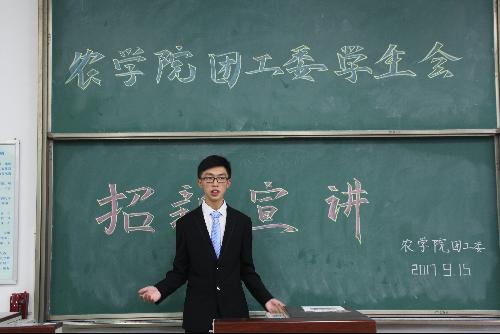 2017年9月15日晚7:30,农学院团工委学生会招新宣讲大会在北校区8T12教室正式举行。招新宣讲大会面向17级全体新生。农学院团工委书记高雪纯、副书记刘涵宇,学生会主席李雨欣以及副主席杨琦、张钰琪、冯远恒等出席了本次大会。