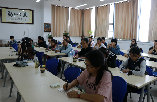 杨黎明主要从摄影基础知识、浅谈构图与色彩、不同场景下的摄影要点、延伸和发散四个方面与在场学生分享交流。杨黎明以通俗易懂的讲解和妙趣横生的比喻令现场的同学们目不转睛,全神贯注。