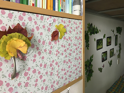 在本次活动中,同学们在宿舍内恣意泼洒自己的想象力。有的同学喜欢军事,于是在宿舍墙上贴满了军事海报、摆满了各种各样的军事模型,在评审团赞叹模型的精致时,123宿舍的王星运同学自豪地表示这都是他自己利用闲暇时间做的手工。有的宿舍则是取材于自然,同学们用捡来红色的七叶树叶、绿色的法桐叶、金色的银杏叶再加上精心挑选的壁纸和别出心裁的布置,令整个宿舍洋溢着秋天独有的绚烂。