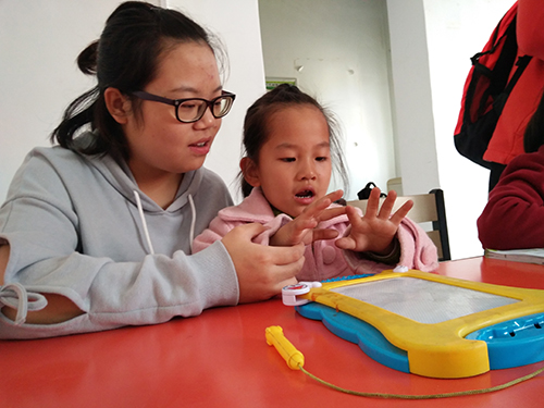 队员们抵达黎陈村村委会后,按照活动前与村委会沟通好的计划,开始今天的活动。一部分队员留在村委会收拾打扫培训室并等待小朋友的到来,另一部分队员在村中进行走访,召集学龄儿童前来参与功课辅导。在与一个小姑娘的妈妈商量过后,队员们成功找到了第一个愿意参加辅导的孩子。这位穿着粉色棉衣、扎着马尾辫的小朋友非常活泼,当问起她是不是认识其他小朋友的时候,她仰起小脸开心的说:“我还有好多小伙伴呢,我去叫他们一起来!”在这个小女孩带领下,队员们顺利的找到9位希望得到功课辅导的孩子,他们基本都是张家港小学和大寨中心小学上学的一年级、二年级生,最小的一位今年才刚刚满7岁。