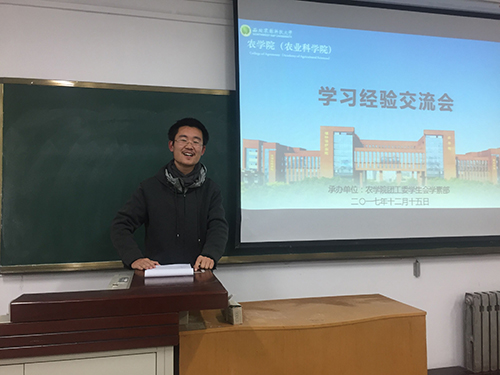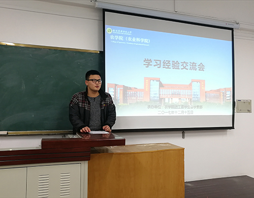 2017年12月15日晚,农学院举行了学习经验交流会,其目的在于培养同学们对学业生涯的方向感、加强同学们的学习意识并提升同学们的学业水平。交流会邀请到了上届学生会主席李宜谦、1602班郭颖彬、1601班杨胜飞三位嘉宾,他们基于自身经历进行了交流演讲,同学们积极活跃,会场氛围十分热烈。