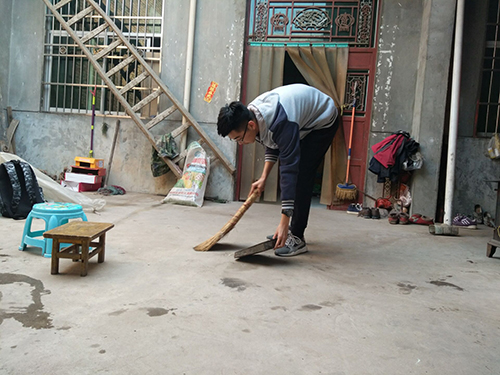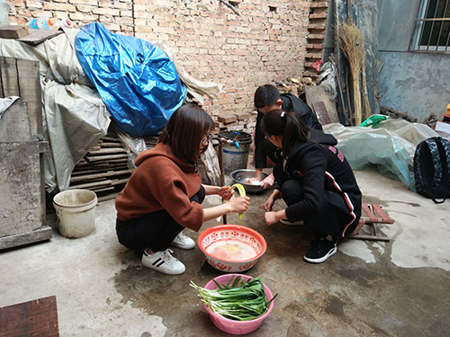 下午3点,张能艳等人在学校附近超市购买面粉、蔬菜、肉等食材以及一些水果。半个多小时的骑行,她们按约定时间来到了孟寨村。刚进村子便遇到了正在清扫道路的孟阿姨,志愿者们跟随着来到孟阿姨家中,瞒着孟阿姨的小惊喜浮出了水面。