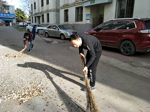 同学们清扫小区内的落叶