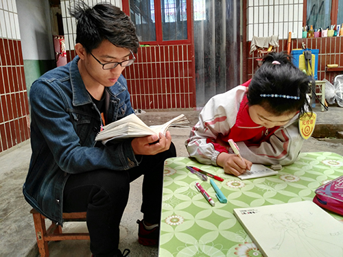 每周末上午,支教小分队准点来到了孟家寨村。按照惯例,小分队成员分别进去不同的小朋友家里,辅导小朋友的功课。孟家寨村的小孩子大部分集中处于小学阶段,个别进入初中。小朋友们的课本知识大部分都比较浅显易懂,志愿者们最开始主要是陪伴监督孩子们完成考试布置的作业。当小朋友们遇到不会或者不动的题目时,志愿者才会根据题目以不同得方式步步引导小朋友解决问题。一道题目解决后,志愿者会根据当前题目在习题册或者自行出题举一反三考验小朋友是否掌握。