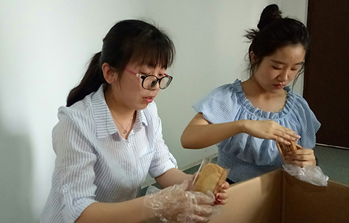 上午9:50,同学们在八号教学楼下集合完毕,乘坐校车前往社会实践地点。10:20大家到达了农科楼。首先,同学们了解到,本次我们参与分装的饼干是科创项目天然彩色小麦的附属产品。这些饼干种类丰富,基本原料为彩色小麦粉。在与蔓越莓,巧克力粉,牛奶等原料有食品厂工人手工制成,不仅味道不错,而且天然健康。