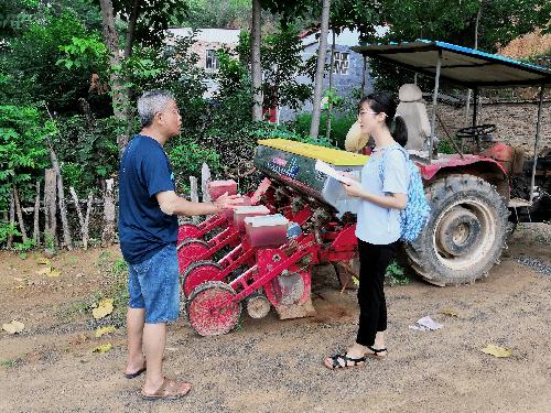 在村委会的安排下,队员们有幸采访到了村支部副书记——张爱丽,张副书记非常欢迎队员们的到来,热情地为队员讲解了北窑湾村的人员组成、耕地面积和五保户的数量与家庭情况。并回答了我们询问的有关施肥、灌溉、播种情况等问题。她高兴的说:“看到你们这些年轻人这么关心农村的现状我十分激动,现在在乡村振兴战略实施下农村的变化非常大,特别需要通过你们的宣传来让大家了解农村的发展现状。”之后,队员们深入村民家中,通过与农民们沟通交流并结合调查问卷,深入地了解农民耕种生活的变化与发展。队员们从农业机械化状况,聊到农田水利情况;从农业社会化服务,谈到了对乡村振兴战略的看法。期间,队员们还采访到了“全国农技推广科技示范户”的王明杰。他热情地招待了队员们并讲述了他走到今天的过程——他从上个世纪的贫困户到新世纪的万元户,再到成为如今的示范户,是离不开国家对农村的各项优惠政策和自己的勤奋努力的。同时热情的王伯伯还带领队员们体验了一下播种机的使用。
