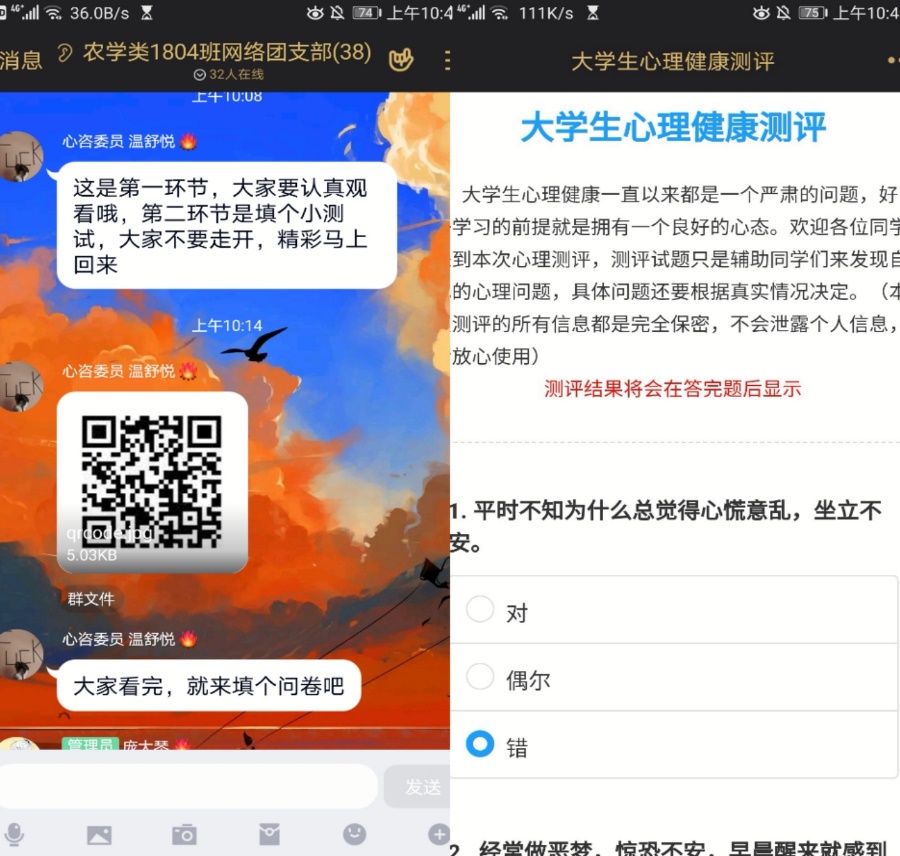 为迎接即将到来的5月25日全国大学生心理健康日并响应学院号召,农学院1804班于2020年5月22日在线上开展了以“聚力同心,战役同行”为主题的心理健康主题班会。