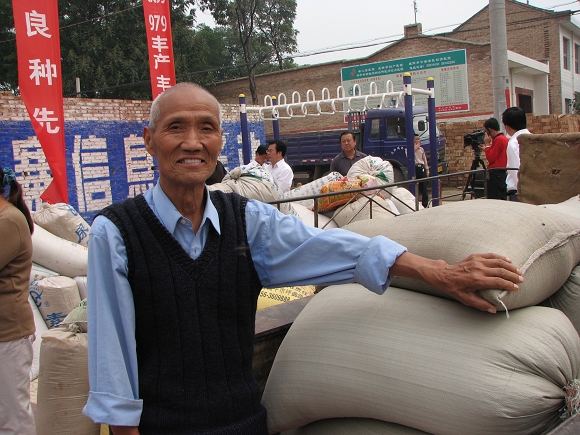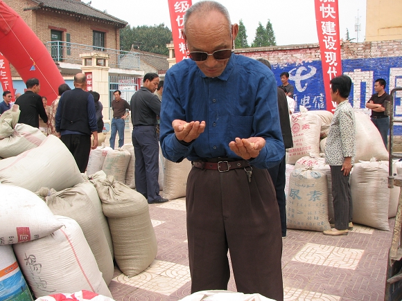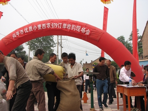 在过去几年,“藁8901”、“郑麦9023”和“西农979”等优质品种的订单收购在河南、山东、河北、安徽等省已经实现。今年西农979在河南省的订单收购价高达0.84元/斤,高于市场普通小麦价15%左右,农民增收显著。相比之下,我省对优质小麦的订单收购工作比较滞后。在新西北种业、西瑞集团、校科研处和兴平市农业局的共同努力和协调下,在国家跨越计划项目的支持下,农业部和陕西省优质小麦主推品种“西农979”在我省率先实现了订单收购,收购价高出市场普通粮价10%左右,每亩小麦可增加收入70元左右。田间硕果累累,丰收在望,村头熙熙攘攘,争相买粮,让我们看几张照片来感受一下现场气氛、分享一下农民的喜悦吧!