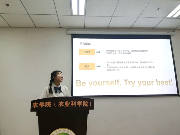 会议伊始,章美琪与学弟学妹们分享了自己的经历与心得,重点从资料信息收集、参加夏令营、预报名、正式推免等方面详细介绍了自己的推免过程,章美琪结合自身经历分享了制作简历、准备材料、联系导师、面试过程中需要注意的问题,她告诉学弟学妹们一定要早关注相关信息,不要惧怕失败,不到最后一刻不能轻易放弃。