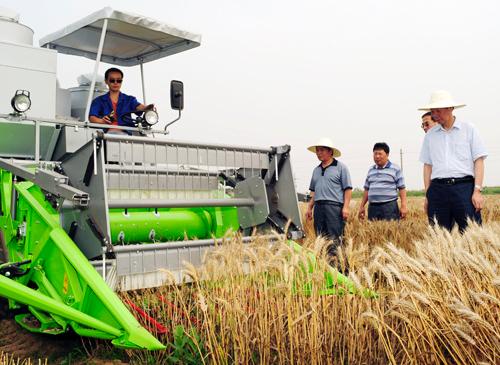 孙武学校长察看我校新购置的小麦收割机的实际使用情况