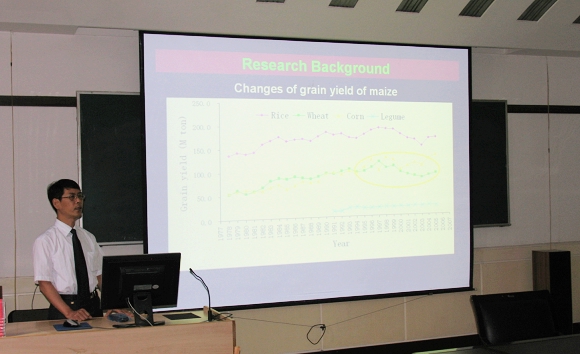 7月6日至7日,韩国首尔大学的郑大浩博士来我院进行学术访问交流,郑大浩博士先后参观了学校农博园、院玉米试验站、玉米育种实验平台及相关的实验室。并应邀为我院师生作了题为“分子标记与分子育种”和“玉米种质分子遗传多样性及中国与美洲玉米间的杂交种表现”的学术报告。郑大浩博士分别从分子标记的定义、类型、引物设计、MAS、QTLs分析及其应用,中美两国自交系遗传多样性、杂交种表现等方面进行了详细的报告;围绕玉米分子育种技术及发展趋势与我院师生进行了广泛交流和深入探讨。