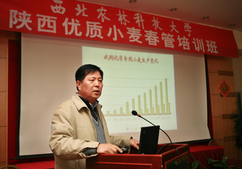 培训会上,国家优质小麦品种“西农979”的培育者、陕西省小麦专业组组长王辉教授讲授了“优质小麦品种及生产形势”,农业部小麦专家指导组成员、陕西省科技入户工程小麦组专家张保军教授讲授了“提升小麦高产优质的技术途径”,陕西省有突出贡献专家、省农业技术推广站王哲笃研究员讲授了“小麦四改技术”,国家优质小麦新品种郑麦9023培育者、国家小麦改良中心杨陵分中心副主任王新中教授作了“陕西2008年春季小麦苗情通报”,中国北方小麦栽培学会理事、陕西省“三五”人才张睿研究员讲授了“小麦春季管理目标与技术措施”。