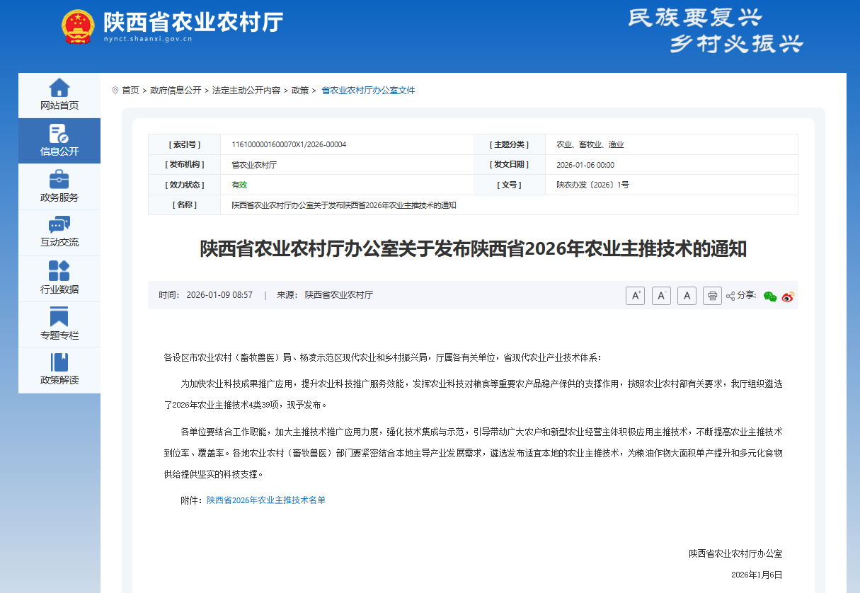 近日,陕西省农业农村厅公布2026年农业主推技术名单,西北农林科技大学农学院5项技术成功入选,其中粮油生产类4项、耕地环保类1项,涵盖小麦玉米高产栽培、水肥调控、耕播一体化等关键领域,为陕西及西北区域粮油稳产增效、耕地质量提升提供核心科技支撑。