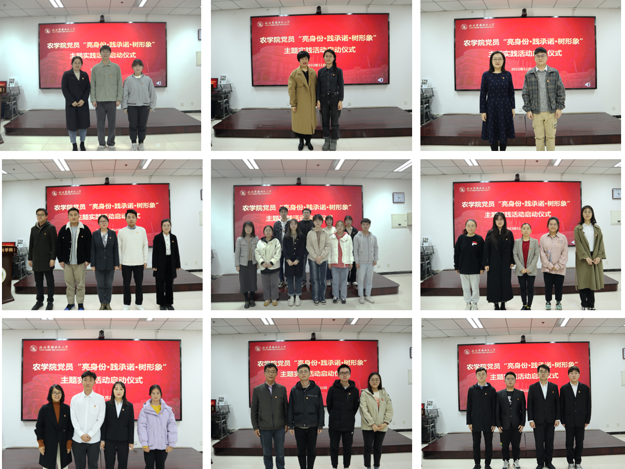 为深入学习贯彻党的二十大精神,巩固拓展党史学习教育成果,进一步增强党员党性修养,发挥党员模范作用,11月22日,农学院在216会议室举行党员“亮身份·践承诺·树形象”主题实践活动启动仪式,学院党委副书记吴清华、各党支部书记、新发展教师党员、新入职学工干部和新发展学生党员参会。启动仪式由学工秘书沙影主持。