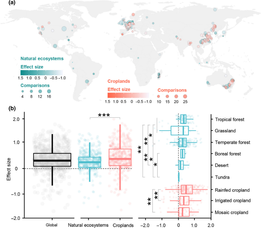 图1 研究点分布和激发效应大小,以及不同生态系统之间的激发效应大小差异。