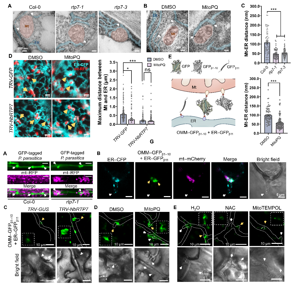线粒体与内质网互作过程中,会形成线粒体外膜—内质网膜结合位点(MAM)复合体结构。作者进一步通过构建基于split-GFP原理的植物MAM检测方法,结合透射电镜观察,明确了mROS促进吸器周围MAM的形成 (图2),作者由此推测mROS可能通过促进MAM形成,进一步促进线粒体与内质网的ROS信号转运。
