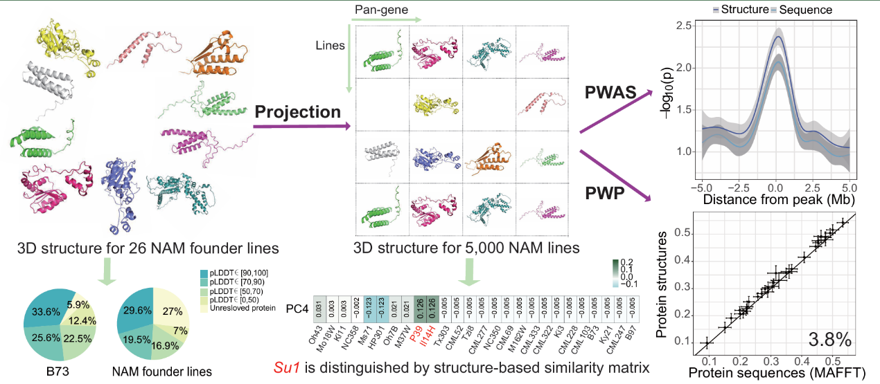 近日,西北农林科技大学农学院玉米生物学与遗传育种团队联合丹麦奥胡斯大学数量遗传中心等国家国际单位在《Genome Research》发表题为“Predicted protein 3D structure provides essential insights into the genetic architecture underlying phenotypic diversity in maize”的研究论文。