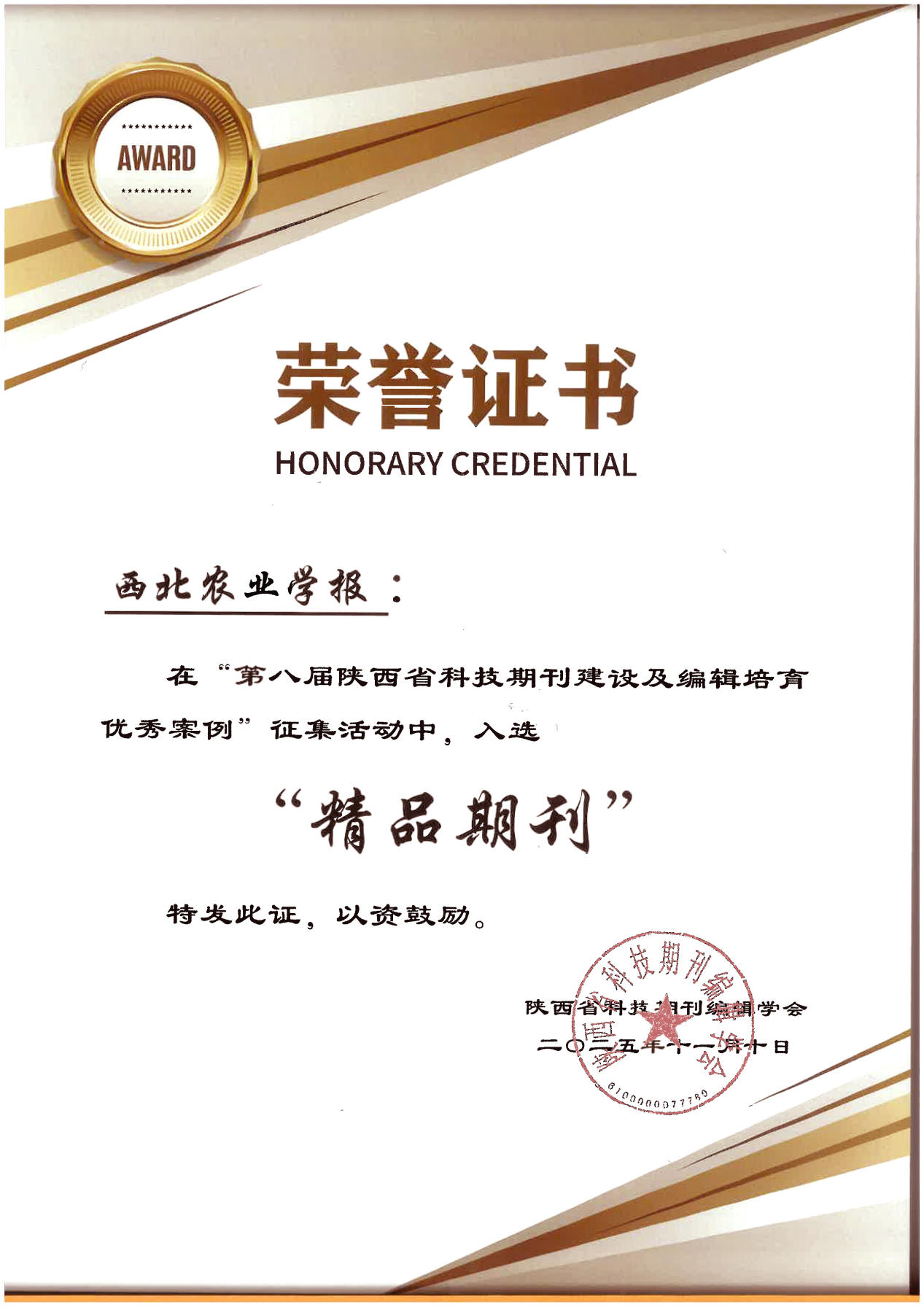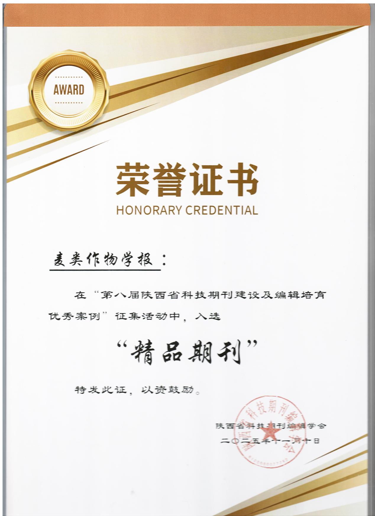 在2025年11月27日至29日召开的陕西省科技期刊编辑学会第九届五次理事会暨2025年秋季学术年会上,第八届陕西省科技期刊建设培育优秀案例评选结果正式揭晓。我院主办学术期刊《麦类作物学报》和《西北农业学报》凭借高质量的学术质量、严谨的编校规范及在农业科研领域的广泛影响力,双双荣获“精品期刊”称号。