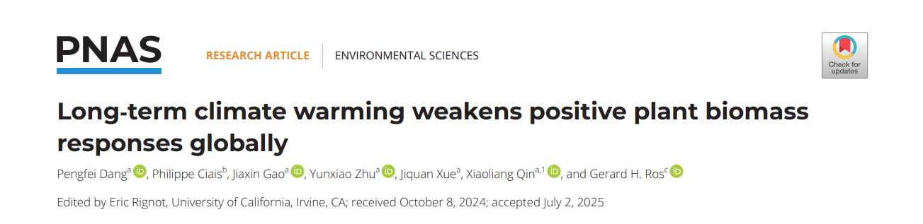 近日,学院秦晓梁教授课题组在国际著名顶级学术期刊《美国国家科学院院刊》(PNAS)发表研究论文“Long-term climate warming weakens positive plant biomass responses globally”。该研究系统评估了气候变暖对全球不同生态系统(农田、草地等)植物生物量的长期影响,发现变暖初期可促进地上和地下生物量增加,但这一正效应会随时间推移逐渐减弱,甚至在高温地区转为负效应。研究首次在全球尺度上揭示了植物生物量对气候变暖存在显著的“时间依赖性衰减效应”,并量化了温度、降水、土壤养分、ph等多重环境因子及其与增温持续时间的共同调节作用对植物响应的调控机制,为深入理解农田和自然生态系统生产力在长期气候胁迫下的变化规律提供了重要参考。该成果不仅有助于评估农业生态系统碳汇功能的演变趋势,也为修正全球碳汇预测、提升相关气候变化模型准确性提供了实证支撑。