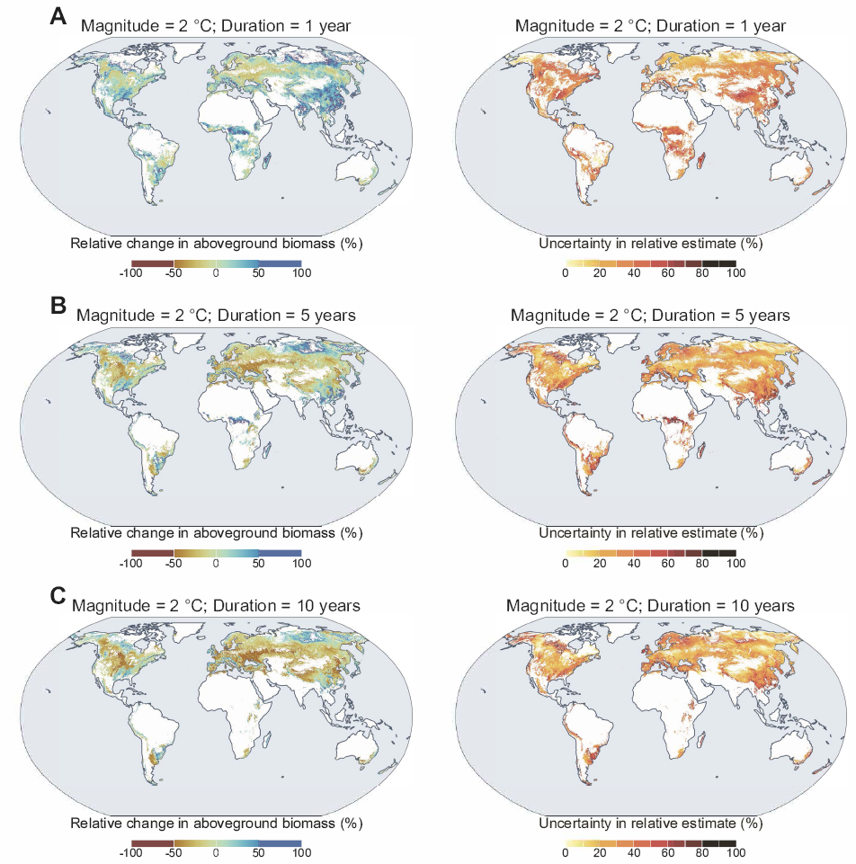 图3 气候变暖对未来2°C增温情景下不同持续时间(1年、5年和10年)地上生物量的影响。左侧显示的是平均相对变化,右侧为相应的不确定性,不确定性基于标准差计算。